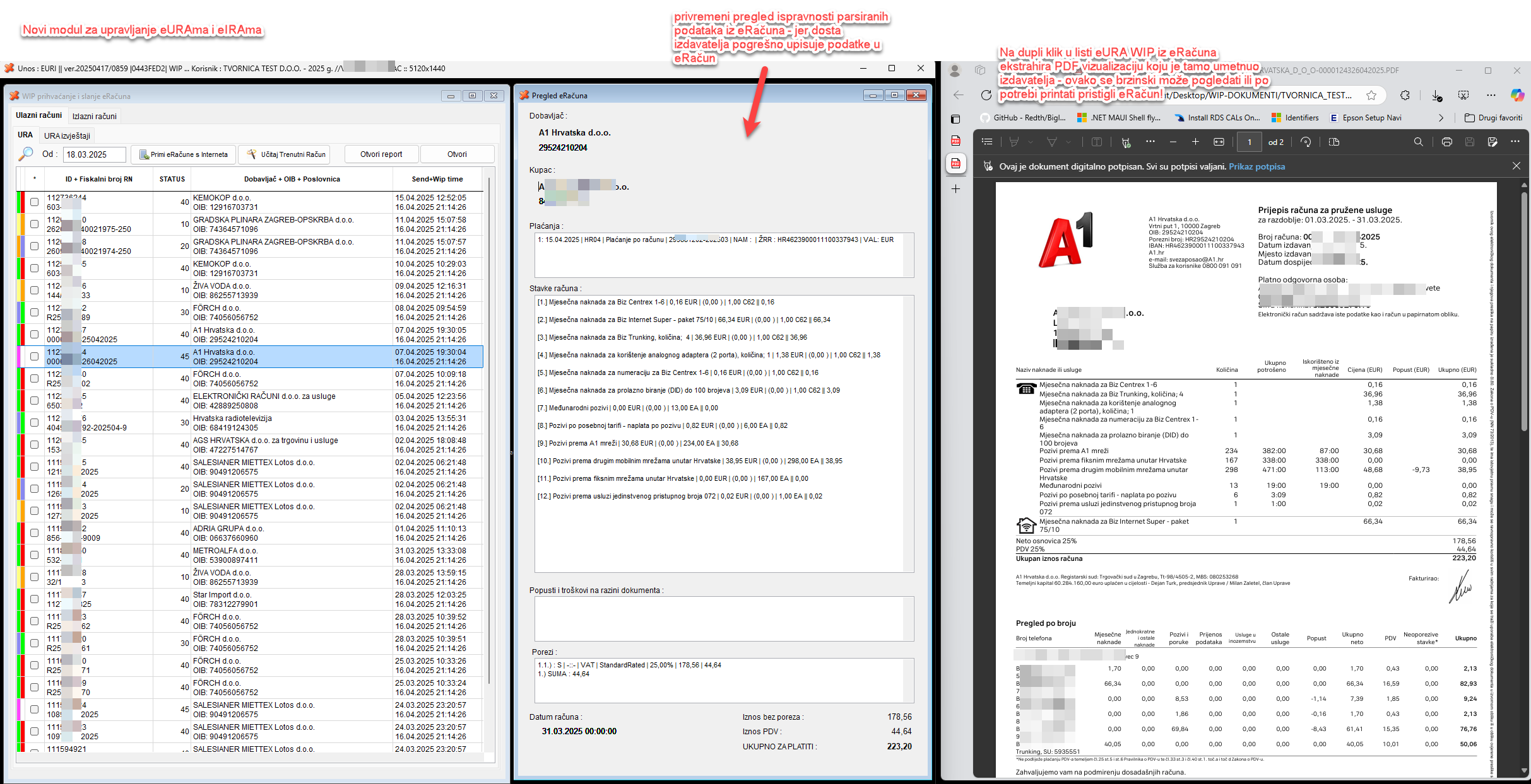 Novi modul se nalazi (za sada) u izborniku "Parametri" > "X.. eRačuni - primanje i slanje", shortcut iz glavnog ekrana WIPa je Xtrl+X, a primanje ulaznih eRačuna, kao i njihovo "parsiranje" (čitanje svih podataka u njemu i punjenje u WIP), dakle već funkcionira. WIP iz primljenog eRačuna već zna parsirati i PDF vizualizaciju koja je umetnuta u pristigli eRačun, pa je modul stvarno već koristan - problem je samo što još ne stižu svi eRačuni putem ovih kanala dostave. Pregled pojedinog računa se ostvaruje duplim klikom na taj račun u listi primljenih eURA.
