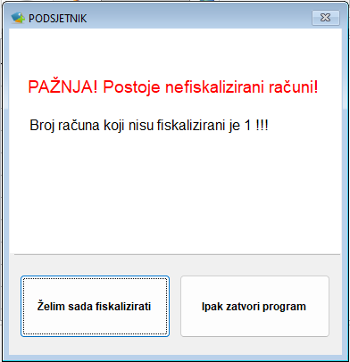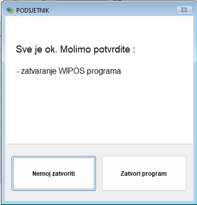Prilikom zatvaranja programa se, od ove verzije WIPOSa, izračunava ukupan broj nefiskaliziranih računa, te se ako je taj broj veći od nula, ispisuje poruka "PAŽNJA! Postoje nefiskalizirani računi!" crvenim slovima. Također, ako postoje nefiskalizirani računi, u ovom se prozoru sada prikazuje tipka "Želim sada fiskalizirati" s kojom se odmah može poći u prozor "Naknadna fiskalizacija računa" a čime se pojednostavljuje i dodatno osigurava i ubrzava proces naknadne fiskalizacije računa.